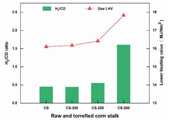 The molar ratio of H2/CO and the LHV of pyrolysis gas products of torrefied corn stalk at 700 °C.