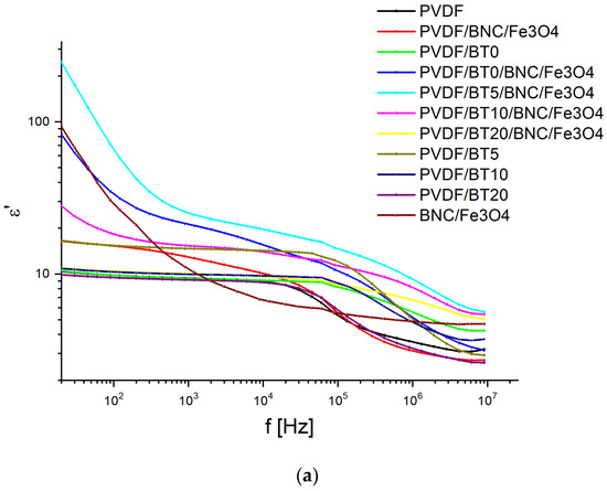 By comparing the PVDF film with PVDF/BT films of different BT activation times, the following observations can be made. The value of the relative dielectric constant for pure PVDF at lower frequencies is around 10, which is confirmed in the literature [6,42].