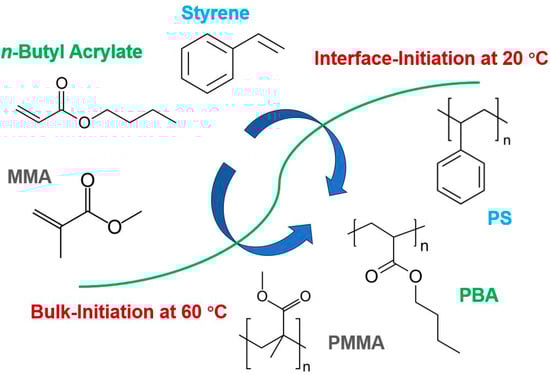Room-temperature polymerization can be achieved through several initiation methods. For example, 2,2′-azobis(4-methoxy-2,4-dimethylvaleronitrile), a low-temperature initiator, decomposes at 30 °C with a half-life of 10 h [10]. Low-temperature initiators require strict regulations and safety measurements as they may explode accidentally under ambient conditions. Redox initiators can initiate polymerization at room temperature efficiently, but metal complexes are usually required [11,12,13,14]. Photo and γ-radiation are also used for initiating polymerization at room temperature [9,15,16], but they are limited by production scale and may not work for some systems [17]. The interfaces in emulsions were found to lower the activation energy for initiator decomposition, consequently initiating polymerization at room temperature [1,18]. Interface initiation does not require hazardous compounds or additional devices to conduct room-temperature polymerization in an emulsion system. Therefore, interface initiation is considered an efficient eco-friendly technique for room-temperature polymerizations.