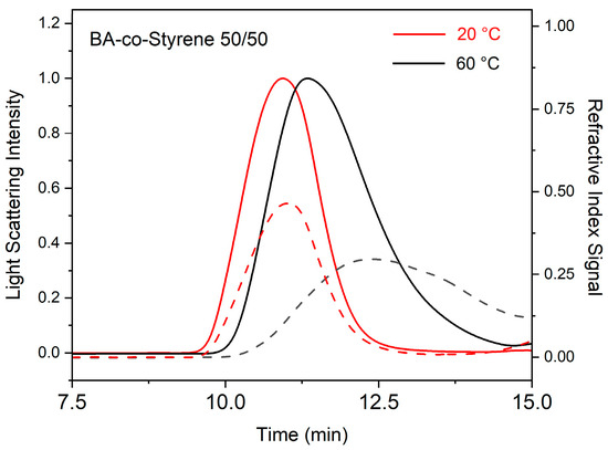 The light-scattering detector intensity (solid line) and the refractive index detector intensity (dashed line) obtained from gel permeation chromatography as a function of the elution time for the extracted butyl acrylate-co-styrene 50/50 polymers synthesized at 20 °C and 60 °C.