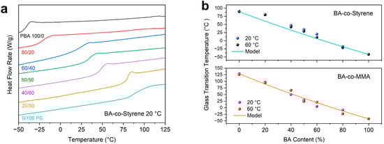 (a) Differential scanning calorimetry thermogram of the BA-co-styrene copolymers synthesized at 20 °C; (b) glass transition temperatures of the BA-co-styrene and BA-co-MMA copolymers.