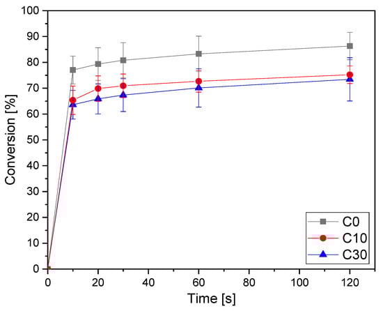 Conversion curves as a function of irradiation time for the formulation C (from ATR-FTIR) as a function of time varying bio-glass concentration. Light intensity was set at 130 W/cm2.