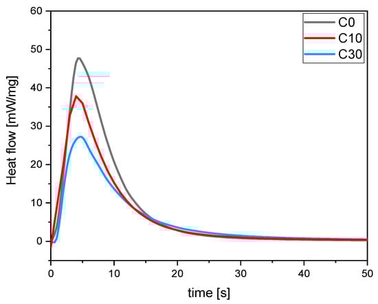 Photo-DSC experiments were conducted to validate the ATR-FTIR analysis. The hexotermicity data for all the investigated formulations are presented in Table 4. In Figure 2, an example for the same C formulation with different bio-glass content is reported.