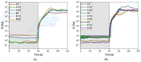 (a) Photo-rheology results of formulation from A to B; (b) photo-rheology results of formulation from C to E. For all the tests the UV-light irradiation started after 60 s.