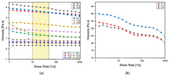 (a) Formulation viscosity measured from 1 to 1000 shear rate [1/s] with a plate of 2.5 mm diameter. In yellow the shear rates typical of a 3D printing process are evidenced; (b) viscosity reference of AESO samples without reactive diluent. All the values were measured with a 2.5 mm diameter plate.
