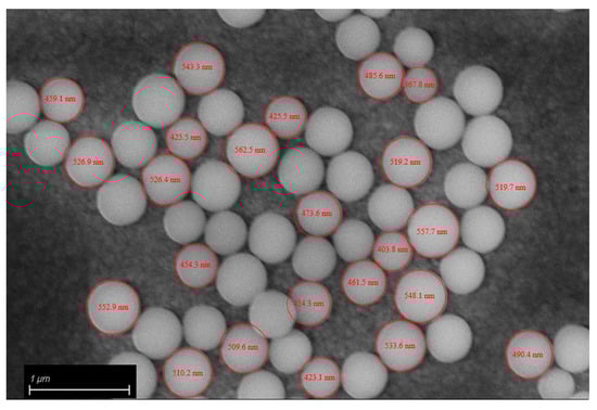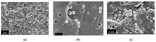 SEM analysis of the fracture surfaces of 3D-printed samples revealed an optimal distribution of BG S4 within the polymeric matrix. Figure 6 reports the SEM images relative to samples containing 10 and 30 phr BG S4. The images show that the bioactive glass particles were well dispersed throughout the samples, and the aggregates were limited in amount and dimension. Figure 7 shows the presence of single dispersed particles with an average dimension of 489 ± 54 nm.