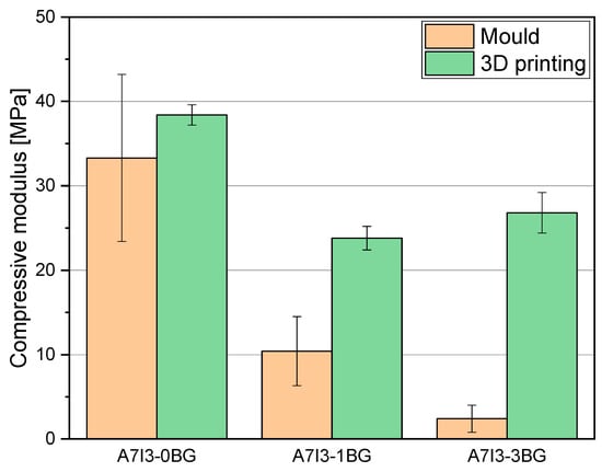 Considering the mould-printed samples, the observed decrease of the modulus can be attributed to the lower Tg and lower conversion of samples with higher BG S4 content, as previously discussed. These factors contribute to a reduction in the compression resistance of the material. Furthermore, a notable increase of the modulus is observed in the 3D-printed samples compared to the mould-printed samples, indicating that the 3D printing method enhances the overall mechanical characteristics of the final product, as already pointed out.