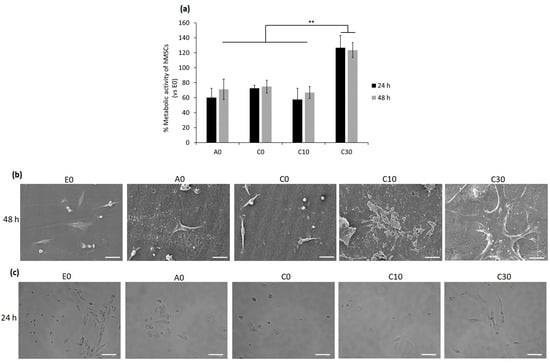Cytocompatibility evaluation of the specimens with different ratios AESO:IBOA and phr BGs towards bMSCs. Direct seeding cells on to the specimens’ surfaces: (a) Metabolic activity of the cells after 24 and 48 h; the results were normalized with E0 as control samples (** indicates p ˂ 0.01); (b) SEM images of the surface-attached cells after 48 h (scale bar is 50 µm); reseeding the floating cells; (c) bright field microscope images, 24 h after reseeding the floating cells in a new 24-multiwell plate (scale bar = 100 µm).