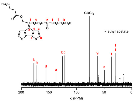 Figure 2 shows the synthetic pathway of PCPDT-CO2H. The key compound is CPDT. Several synthetic pathways have been reported for the synthesis of CPDT [42,43,44]. Based on the results of our preliminary experiments, we synthesized CPDT by modifying the procedure [45] reported by Pal et al. CPDT was synthesized using 3-bromothiophene (1) and thiophene-3-carbaldehyde (2) as starting materials in 4 steps. In order to introduce carboxyl functionalities on the side chain of CPDT, we first carried out condensation reaction between CPDT and 2-(2-bromoethoxy)tetrahydro-2H-pyran, to obtain CPDT-OTHP that carries hydroxyl functionality masked as the 2-tetrahydopyranyl ether (THP group). This is because the THP group is stable during condensation reactions under alkaline conditions. Then, we carried out the deprotection of THP group to liberate the hydroxyl functionalities. Finally, the reaction of CPDT-OH with succinic anhydride gave the desired monomer, CPDT-CO2H, utilizing a well-known reaction between alcohol and succinic anhydride. The structure of CPDT-CO2H was confirmed by 1H and 13C NMR spectra, as shown in Figure 3 and Figure 4, respectively. These Figures show peak assignments.