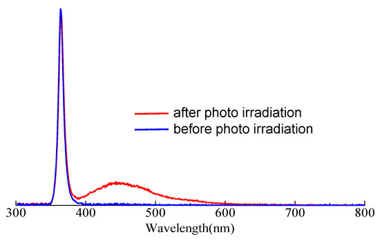 PL spectra of aqueous coumarin solution, (blue line) before and (red line) after photo irradiation (λex = 365 nm).