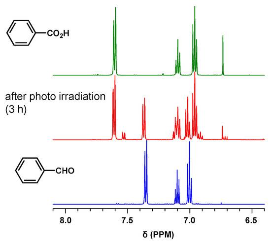 Finally, we demonstrated that PCPDT-CO2H efficiently could catalyze the oxidation of benzaldehyde under photoirradiation. PCPDT-CO2H was added to a chloroform solution of benzaldehyde. Upon photoirradiation (using a Xe lamp) of the reaction mixture, the conversion from benzaldehyde to benzoic acid was estimated using 1H NMR (Figure 10). After 3 h of irradiation, the conversion reached 70%. Since benzaldehyde is easily oxidized in the air [51,52], control experiments were performed. Under the same irradiation conditions without PCPDT-CO2H, the conversion was only 10%. No reaction occurred when PCPDT-CO2H was added to the benzaldehyde solution in the dark for 3 h. These experimental results indicated that PCPDT-CO2H efficiently catalyzed the oxidation of benzaldehyde under photoirradiation.