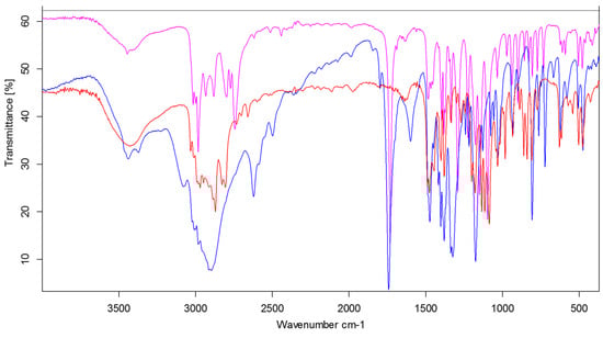 IR spectra of oxy-QPSs 4 (tri-tert-butyl((2-methoxyethoxy)methyl)phosphonium chloride) (red), 8 (tri-tert-butyl(5-carboxypentyl)phosphonium bromide) (blue), and 11 (tri-tert-butyl(2-iso-propoxy-2-oxoethyl)phosphonium bromide) (purple).