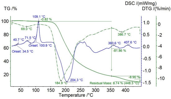 TG-DSC curves for 3 (tri-tert-butyl(2-ethoxyethyl)phosphonium bromide): TG curve (green line), DSC curve (blue line), and DTG curve (green dashed line).