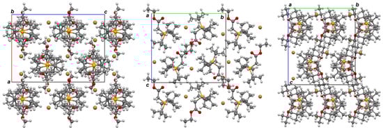 The crystal structure of oxy-QPSs essentially depends on the type of side chain substituent and on the type of anion. Specifically, the compounds form non-isostructural crystals, so no one can observe any trend in the features of crystal packing. For example, compounds 9–11 with homologically close cations and identical anions are characterized by a different three-dimensional lattice and localization of anion (Figure 5).