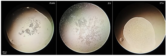In the first series of experiments, we used phosphonium salts under the study to dissolve microcrystalline cellulose. As oxy-QPSs are solids at room temperature and melt above 100 °C, a co-solvent was used to reduce the viscosity. Mixtures of ILs and organic solvents are extensively used for biomass pretreatment []. The co-solvent also acts to decrease the cost of the dissolution process. The most popular of them is dimethyl sulfoxide (DMSO). It is an aprotic, inexpensive, and non-volatile organic solvent that is obtained as a by-product of the pulping industry in lignin production []. DMSO is readily miscible (1:1 by mass) with most of the oxy-QPSs under study. DMSO has no significant influence on the specific interactions between organic salts and dissolved cellulose []. Stirring of 1 wt% microcrystalline cellulose (50 µm) in pure DMSO at 80 °C for 17 h did not lead to the dissolution of the biopolymer (Figure 6).