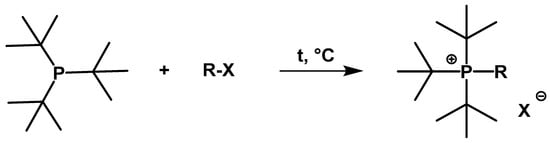 Tri-tert-butylphosphine and alkylating agent were stirred at 50–100 °C for 4–8 h. The reaction mixture was cooled; white solid was washed with diethyl ether (see Supplementary Materials for details). For couple of syntheses, the solvent acetonitrile was used. After cooling, the reaction mixture solvent was evaporated and then washed with diethyl ether.