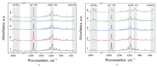 FTIR-spectra for PCL (1) and for PCL/MMT composites (2–5), prepared by solution-casting (a) and by melt extrusion (b): 1—PCL, 2—PCL/MMT 5%, 3—PCL/MMT 10%, 4—PCL/MMT 25%, 5—PCL/MMT 50%.