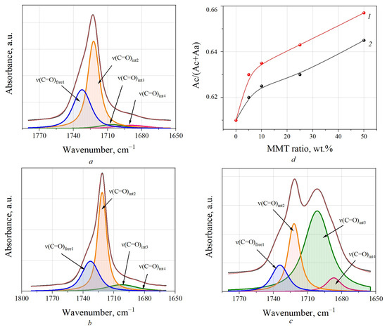 Deconvolution of FTIR spectra in the area of carbonyl groups C=O stretching vibrations for neat PCL (a), S_PCL/MMT 50% (b,1), E_PCL/MMT 50% (c,2), and dependence of the degree of crystallinity Xc on the amount of MMT (d). The black line characterizes the experimentally obtained curve of the IR-Fourier spectrum, the red line reflects the result of deconvolution of the spectra.