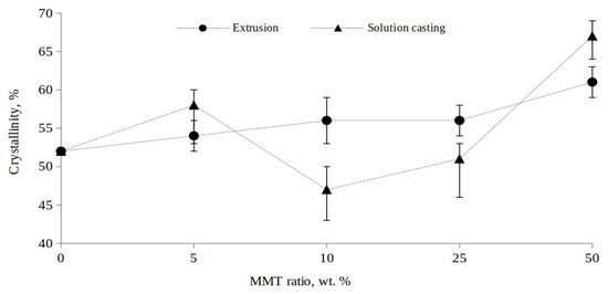 A graph showing the dependence of Ac/(Ac + Aa) on the amount of MMT is presented in Figure 3d. It is clearly seen that with increase in the amount of MMT, the crystallinity of the PCL/MMT granules increased in the case of both solution-casting and melt extrusion, but a more prominent increase was observed for the PCL/MMT granules prepared by solution-casting.