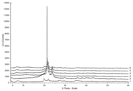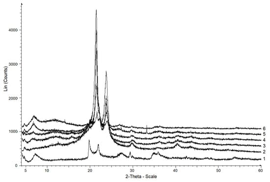 X-rays of MMT (1), PCL (2) and E_PCL/MMT granules prepared by extrusion with different MMT content: 3—5%, 4—10%, 5—25%, 6—50%.