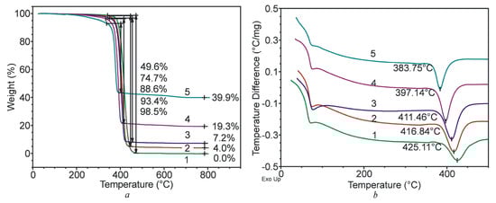 TGA (a) and DTA (b) curves of PCL (1) and E_PCL/MMT granules prepared by extrusion with different MMT content: 2—5%, 3—10%, 4—25%, 5—50%.