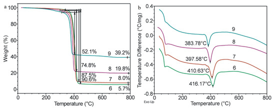 TGA (a) and DTA (b) curves of S_PCL/MMT granules prepared by solution-casting with different MMT content: 6—5%, 7—10%, 8—25%, 9—50%.