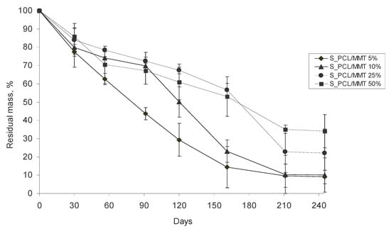 The biodegradation of polymer granules in soil occurs due to microbial activity, which depends on the ability of bacteria to produce enzymes which can facilitate the scission of complex polymer bonds. It was assumed that the inclusion of MMT in the PCL granules would correlate with mass loss of the granules and decrease the time for their degradation. However, according to the data on the mass loss of the S_PCL/MMT composite granules (Figure 10) obtained from the solution, we observed the opposite effect. Within 30 days, there were no significant differences in the residual masses between the granules with different MMT content. After 56 days, the S_PCL/MMT 5% granules degraded more rapidly, and on the 90th day, the residual mass of granules was 43.6%. In contrast, the equivalent values for S_PCL/MMT 10%, S_PCL/MMT 25% and S_PCL/MMT 50% were 69.8, 72.4 and 67.1%, respectively. On the 120th day of the experiment and up to the end, the S_PCL/MMT 5% granules appeared to demonstrate the greatest mass loss and degraded by 91.0%. The S_PCL/MMT 10% granules also degraded by 89%. The least rapid degradation from the 56th day and up to the end of the experiment was demonstrated for the S_PCL/MMT 50% and the S_PCL/MMT 25% granules. On the 245th day, the degrees of degradation for these granules were 66.0 and 73.4%, respectively. The corresponding residual masses were 34 and 26.6%.