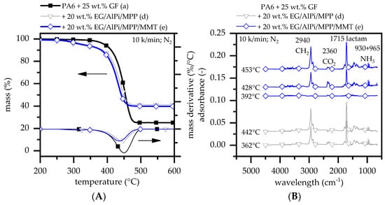 When integrating EG (15 wt.%), AlPi (3 wt.%), and MPP (2 wt.%) as a multi-material system into glass-fiber-reinforced PA6, two gravimetrical decomposition steps can be observed (Figure 2A). Similar to recipes based on glass-fiber-reinforced PA6 and EG, the initial gravimetrical step occurs between 270 °C and 330 °C marking the start of the EG expansion process. Exceeding 330 °C, the decomposition process accelerates between 400 and 470 °C. The DTG peak occurs at 443 °C, which is slightly higher than that observed for reinforced PA6/EG formulations (437 °C). The residue formation of 41 ± 1 wt.% (500 °C) is in line with expectations. Similar results have been reported in previous studies for non-reinforced PA6 [23,25,35].