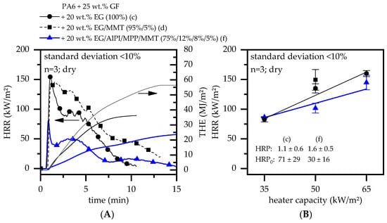 Non-modified glass-fiber-reinforced PA6 is usually characterized by a steep increase in the heat release rate (HRR) (Figure 3A). Since a large fraction of polymeric fuel had been burned by the time the peak heat release rate (pHRR) was reached, the subsequent steep HRR decrease could be attributed to a quick reduction in the pyrolysis gas flow rate. No plateau formation could be observed for the given sample thickness, indicating no stationary burning state. Thus, further acceleration of the heat development would likely occur for thicker samples. By incorporating MMT into the glass-fiber-reinforced PA6, a substantial change in the burning characteristics could be observed. Ignition occurred slightly earlier, followed by a steep increase in the HRR and a subsequent plateau formation. Since the heat development continuously decreased since then, decay of the pyrolysis gas evaporation could be assumed. As a result, the pHRR decreased by about 57% compared to the non-flame retardant PA6/GF.