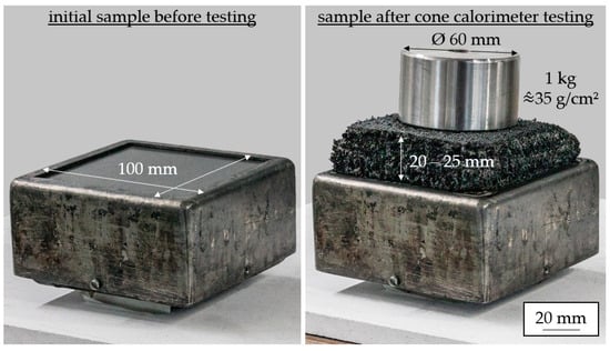 The multi-material formulation (EG/AlPi/MPP/MMT) also showed superior properties regarding the residue stability. Figure 5 shows images of samples before and after cone calorimeter testing. The residue stability is visualized with a one kilogram weight, representing an area load of 35 g/cm2. No penetration of the weight into the residue surface could be identified.