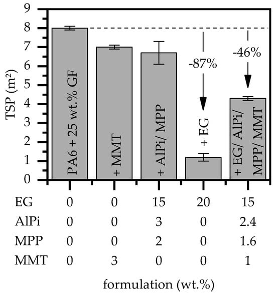 The TSP measured for all of the tested formulations was in a range between 1.2 and 8 m2 (Figure 6). Formulations containing only AlPi/MPP or MMT compared to non-modified PA6/GF resulted in a slightly lower TSP between 6.5 and 7, which can be attributed to an overall reduction in the burning rate. The lowest value was observed for formulations containing only EG, since the flame retardancy mechanism is solely physical and provides an overall very low burning rate through voluminous residue formation. Through the integration of AlPi/MPP and MMT, the decomposition path is slightly disturbed, which leads to more incomplete combustion than that found solely for EG integration. As a consequence, the smoke production increases to 4.3 m2. All major cone calorimeter results are listed in Table 4.