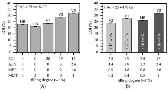 LOI and UL-94 testing results conducted for a sample thickness of 2 mm. (A) Results for singular and multi-material flame retardant additive integration. (B) Results of different filling degrees for two EG/AlPi/MPP/MMT formulations.