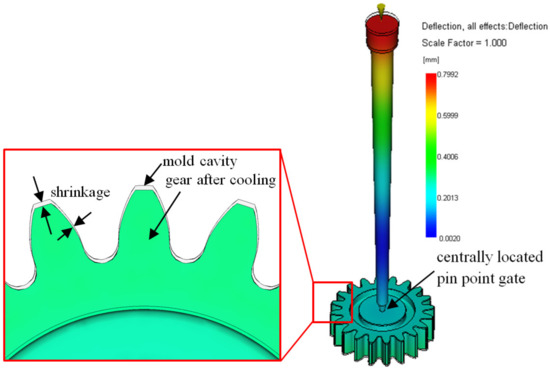 A dedicated injection-molding tool with a standard frame and an exchangeable single-cavity mold insert was produced. Prior to the production of the mold cavity, injection-molding simulations were conducted in Autodesk Moldflow Synergy 2015 (Autodesk, Inc., San Francisco, CA, USA) in order to verify the cavity filling and the gate design, and to calculate the shrinkage of the gear after cooling (Figure 1). The simulation-calculated shrinkage of 2% was considered when producing the cavity by the wire electrical discharge machining (WEDM). The melt was delivered to the cavity through a standard PGH4A5-52.5-P1.3-A1-K20-B30 Misumi pinpoint gate insert. The gate location was positioned in the center of the gear, as presented in Figure 1. The mold temperature was measured with a thermocouple type J (Fe-CuNi DIN EN60584) on the injection and the ejection side of the tool. A hot runner system (Mold-Masters Europa GmbH, Baden-Baden, Germany) with a single nozzle was used.