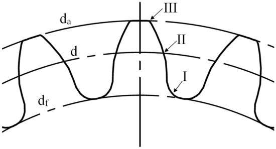 Region I (at the root diameter df), region II (at the reference diameter d) and region III (at the tip diameter da), along the tooth height, were selected for the crystallinity measurement.