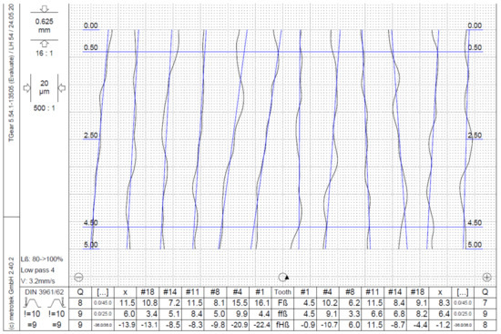 A representative example of the lead quality measurements report. Six teeth were measured and the lead quality parameters, i.e., Total helix deviation—, Helix form deviation— and Helix slope deviation—, were evaluated for the right and left tooth flank. Q denotes the achieved quality grade, x is the average value of six measurements, # denotes the number of the measured tooth, ! defines the requested quality grade.