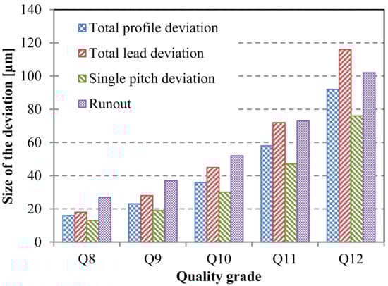 When assessing the strength of polymer gears, the current VDI 2736 [6] design guideline lacks methods to account for these influences. Instead, there exists an empirical guideline that suggests, in cases where , the root load factor , and a similar guideline applies to the flank load factor . This assumption is being tested in this investigation, which involves the examination of gears with a ratio of 6 and quality grades ranging from Q8 to Q12 (DIN 3961/62 [40]). The highest deviations for the main gear-quality parameter and individual quality grades from Q8 to Q12 are illustrated in Figure 5. For the purposes of this study, it was presumed that lead deviation and pitch deviation are the most influential parameters affecting the stress state. Consequently, these two parameters were analyzed by employing numerical means utilizing the finite element method (FEM).