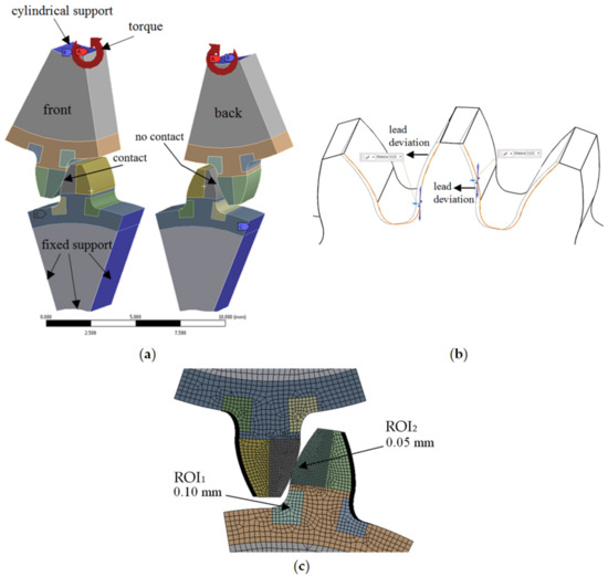 (a) Supports and loads in the numerical model employed for the lead-quality characterization (b) Principle of modeling the lead deviation, (c) Finite element mesh in the regions of interest ROI1 and ROI2, where the calculated stress was analyzed.
