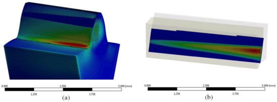 The gears were positioned into mesh to simulate the worst-case misalignment, aligning the maximum lead deviation of the drive gear with that of the driven gear. The mesh positioned the gears at the highest point of single-tooth contact for the driven gear, depicted in Figure 6b. Initial load resulted in a line contact on one side of the teeth due to the modeled lead deviations. The material’s elastic properties prompted the formation of a broader contact area under load, evident in the simulation outcomes.
