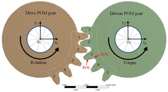 The evaluated scenarios assumed a worst-case alignment of polymer gears of identical quality grade, with a focus on POM/POM gear pairing. In FEM simulations, the material characteristics were represented as linearly elastic, employing the material properties outlined in the manufacturer’s datasheet, as presented in Table 2. The presumption of linear elastic behavior is commonly employed in polymer gear-design stress calculations, as the computed strains remain below the polymer material’s yield point [8,27]. It was affirmed by Černe et al. [57] that the assumption of linear elastic mechanical behavior provides a suitably accurate approximation of the material’s performance for practical thermo-mechanical modeling purposes in gear design applications.