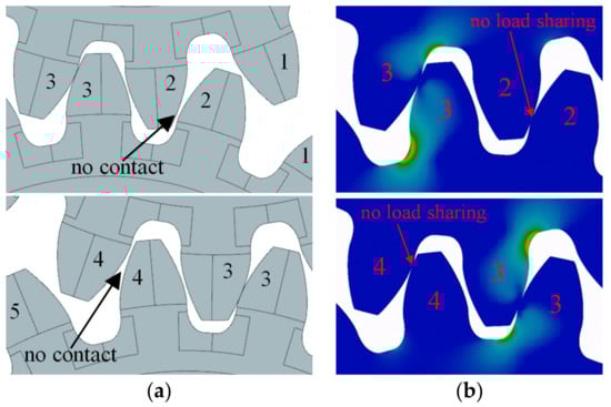 Effect of modeled pitch deviations (teeth pair 3) on the load sharing; when the teeth pair 3 is meshing there is no contact between teeth pair 2 and teeth pair 4: (a) Undeformed geometry/no load, (b) Stress distribution under load.