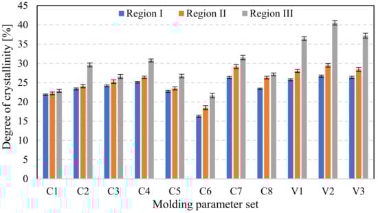 The results of the crystallinity study are shown in Figure 10. Crystallinity levels ranging from 16% ± 0.27% to 41% ± 0.6% were observed, showing a strong dependence on the process parameters and the location of measurement. The mold temperature and cooling time were found as the most influencing process parameters on the degree of crystallinity. Therefore, sets C4 and C7 exhibit the highest degree of crystallinity among the analyzed process parameters for the classical injection molding (C1 to C8). In all cases, the highest degree of crystallinity was measured in region III (tooth’s tip) in contrast to region I (tooth’s root), where the lowest levels were found. Melting temperature, packing pressure, and packing time were found not to have a significant effect on the degree of crystallinity. The reason for such behavior is that the tempering medium has less influence in the root region of the tooth. When employing the Variotherm technology (V1 to V3), increased levels of crystallinity were observed in all monitored tooth regions. The observed behavior was again correlated with the proximity of the tempering channel. Variotherm technology had the greatest effect on the area closest to the tempering channels. The greatest temperature variation during one cycle was in region III.
