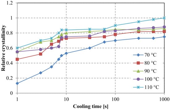 For comparison reasons, crystallinity curves for a neat resin, generated by a Flash DSC method, are presented in Figure 11. Based on the presented measurements for the neat resin, preferred molding parameters can already be selected. It can be observed that a 90 °C mold temperature and cooling times between 10 and 20 s will result in a high degree of crystallinity.