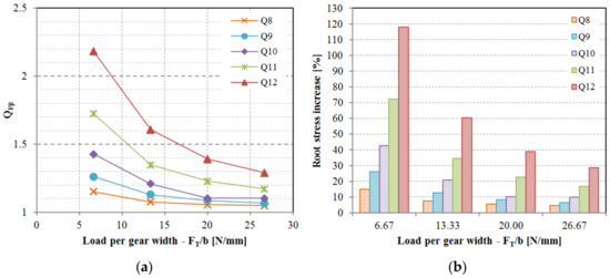 The effect of lead deviation on the root stress: (a) Factor considers the effect of lead deviation on the root stress increase, (b) Root stress increase depending on the lead quality grade and relative load on the tooth.