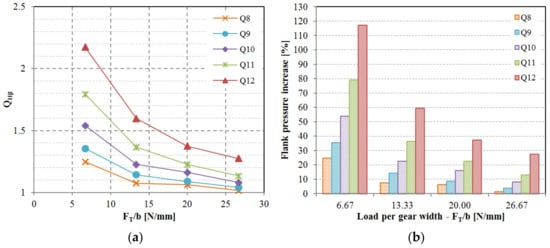 The effect of lead deviation on the flank pressure: (a) Factor considers the effect of lead deviation on the flank pressure increase, (b) flank pressure increase depending on the lead quality grade and relative load on the tooth.