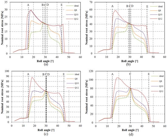 Evolution of root stress in the drive gear for analyzed loads and selected pitch quality grades: (a) 6.67 N/mm, (b) 11.33 N/mm, (c) 20 N/mm, (d) 26.67 N/mm.