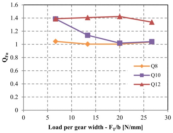 The ramifications of pitch deviation on root stress progression are depicted in Figure 14. In instances of lower-quality grades such as Q12 and Q10, coupled with low-to-medium loads, the computed root stress is most elevated during the initial stages of meshing. This suggests the presence of a solitary tooth engagement throughout the meshing cycle, rather than double-tooth contact. A comparison with the root stress evolution for an ideal geometry reveals that peak root stress should emerge when the gears mesh at the pinnacle of single-tooth contact. As the load increases, tooth deflection intensifies, leading to the establishment of double-tooth contact. The factor, determined using Equation (6), is exhibited in Figure 15. The incorporation of tooth deflection effects is achieved through the analysis of varying normalized loads, encompassing cases of = [6.67; 13.33; 20; 26.67].