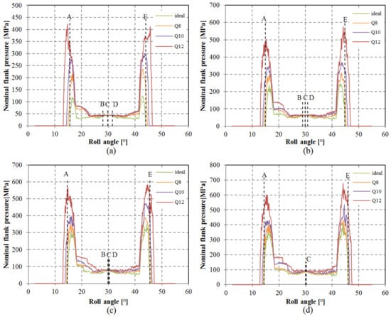 Anticipating that pitch deviations could also influence contact pressure, this aspect was investigated as well. The evolution of contact pressure for the assessed load scenarios is outlined in Figure 16. Maximum contact pressure typically arises within the single-tooth contact region, spanning points B and D. Consequently, standard calculation methods extend contact pressure calculation to pitch point C or alternatively points B or D. Given that meshing points B, C, and D all reside within the single-tooth contact area, consistency prevails between calculated contact pressure for geometries featuring simulated deviations and an ideal geometry. However, variations were discernible at the commencement and conclusion of the meshing cycle, wherein lower gear-quality grades yielded elevated calculated contact pressure (Figure 17). These regions involve heightened sliding, which, in conjunction with augmented pressure, may lead to increased wear.