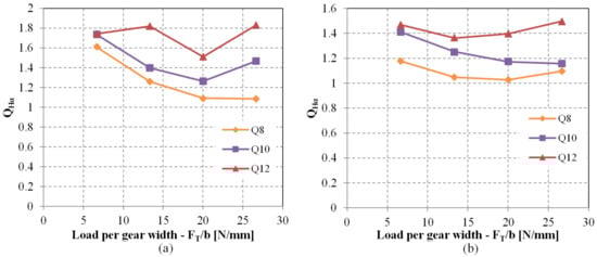 The impact of lead deviation on root stress has been evaluated and can be integrated into the polymer gear design process by introducing novel factor in Equation (1). While the factor is conceptually intended to account for lead deviations, it is important to note that several other potential deviations such as shaft misalignment and deflection have not yet been thoroughly explored in the context of polymer gears. As per the current state of knowledge, for practical purposes, can be equated to . Similarly, the standard factor , which includes lead deviation effects in conjunction with other factors not specifically addressed in this study, can also be approximated by as per Equation (2). The obtained values for the factor are displayed in Figure 12a, and the values for are illustrated in Figure 13a. It was observed that the influence of lead deviation diminishes with higher gear quality grades. The most significant impact of lead quality was noted for quality grades Q10, Q11, and Q12 at lower loads (Figure 12b and Figure 13b). As the load per gear width increases, teeth deflection becomes more pronounced and the effective tooth width expands, resulting in a reduction of the lead deviation effect. This pattern leads to a rapid decline in impact for Q12, Q11, and Q10 quality grades, whereas the effect is less pronounced for Q9 and Q8 quality grades. This observation highlights the potential areas for enhancing gear performance, indicating that improving the gear quality from Q12 to Q11 would have a more substantial stress reduction effect compared to enhancing the quality from Q9 to Q8. It is important to acknowledge that elevating gear quality from Q12 to Q11 or even Q10 can be realized through effective tool design and corrective iterations involving appropriate process parameters, while raising quality from Q9 to Q8 presents a significantly greater challenge.