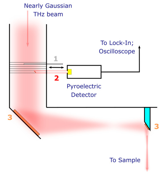 The layout of the pyroelectric detector at the THz beamline of the EPR spectroscopy endstation. Numbers show: 1—movable mechanical shutter; 2—movable copper tube with outer and inner diameters of 8 and 6 mm, respectively, and a copper mirror at one end; 3—off-axis parabolic mirrors. THz beam at the entrance of the optical system is nearly Gaussian [41].