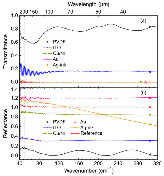 FTIR transmittance and reflectance spectra of PVDF films with different coatings were measured using a Bruker Vertex 80v FTIR spectrometer (Bruker, Billerica, MA, USA) in the far-infrared range using a room temperature PE/DLaTGS D201 detector. The reflectance spectra were measured using A510/Q-T 11 combined transmission and specular reflection accessory.
